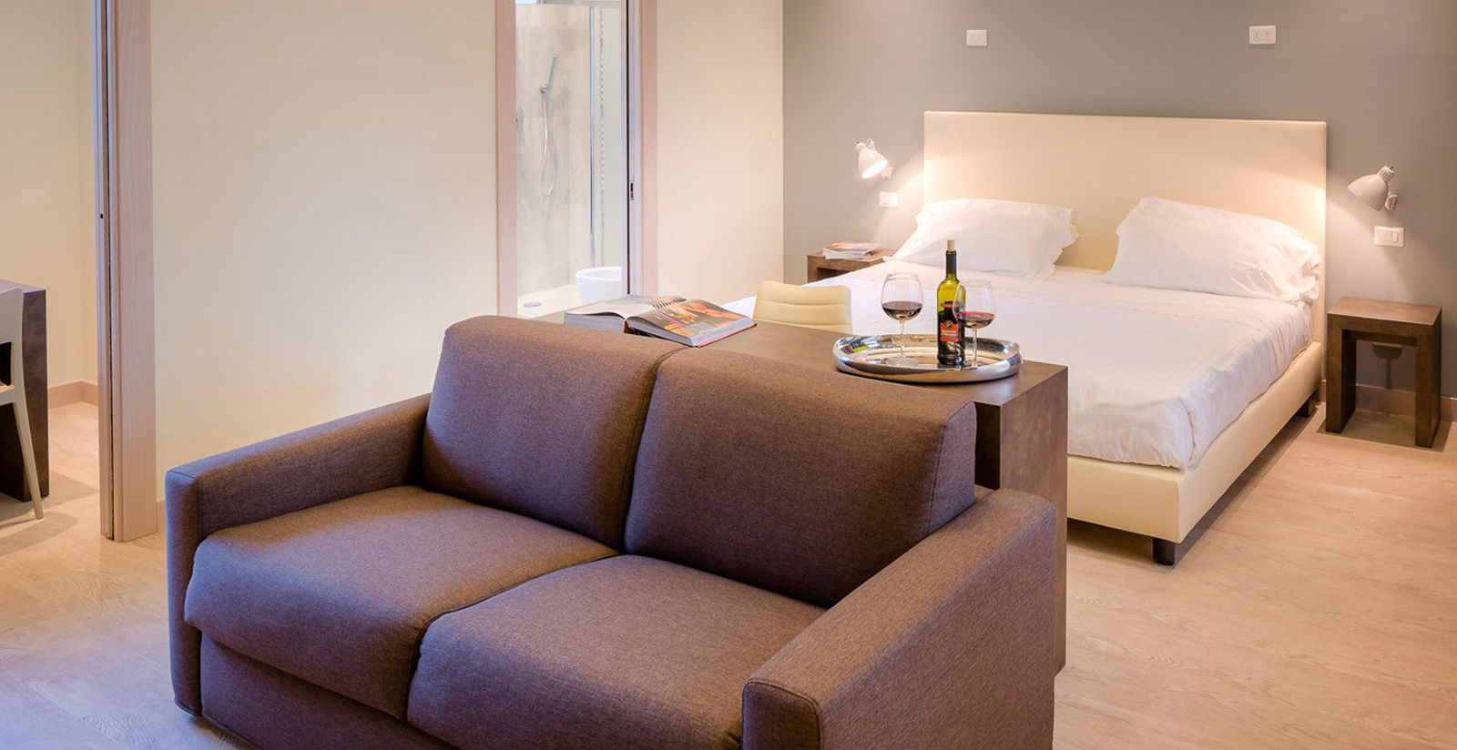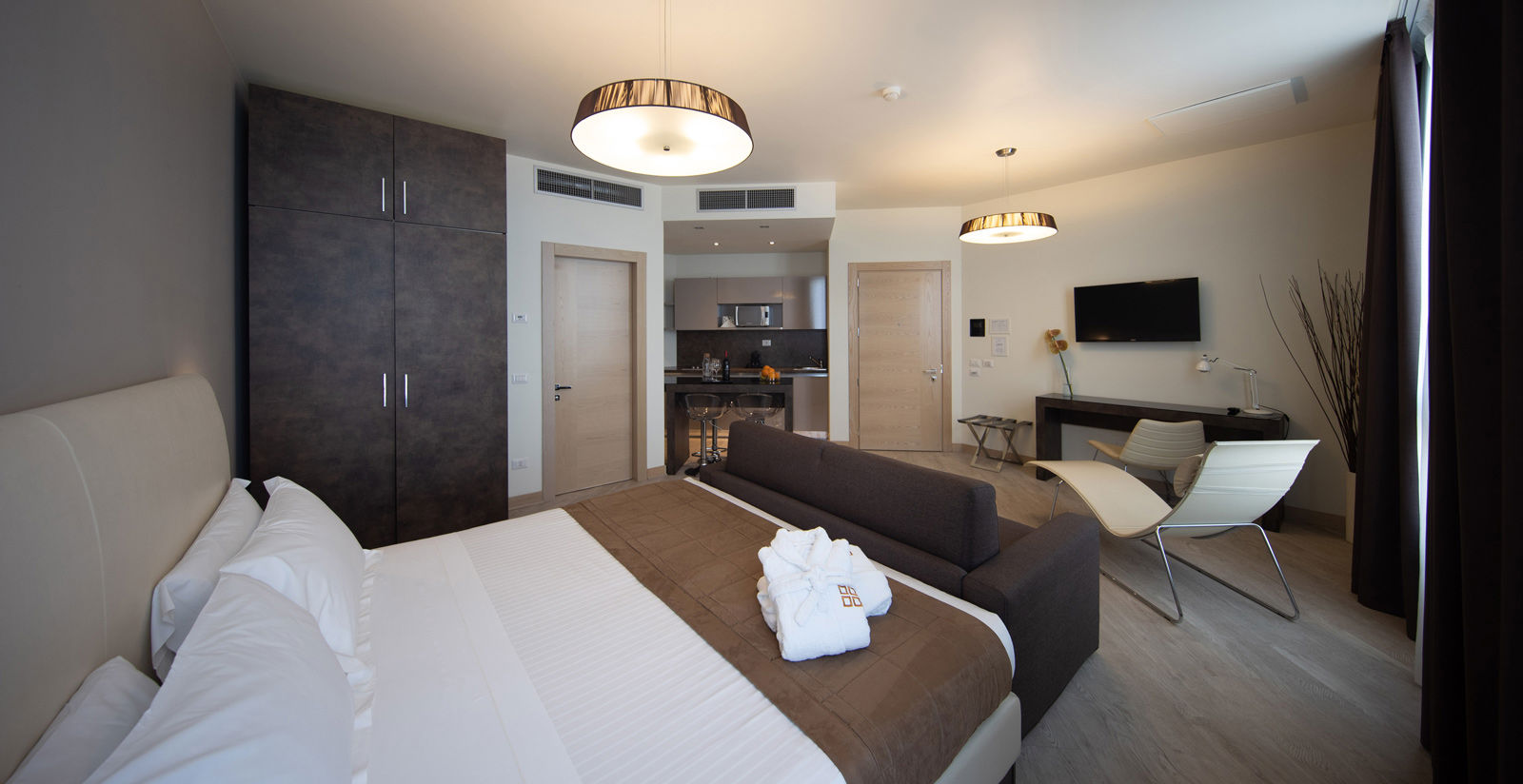 Moderni e ampi monolocali climatizzati con regolazione autonoma ed insonorizzati dotati di zona soggiorno con comodo divano in tessuto anallergico con Smart TV, zona pranzo con angolo cottura completamente attrezzato con: frigorifero, forno a microonde, lavastoviglie, utensili da cucina, piano cottura ad induzione.