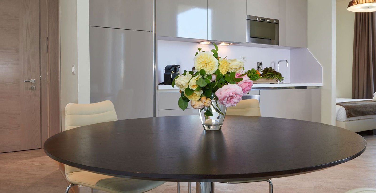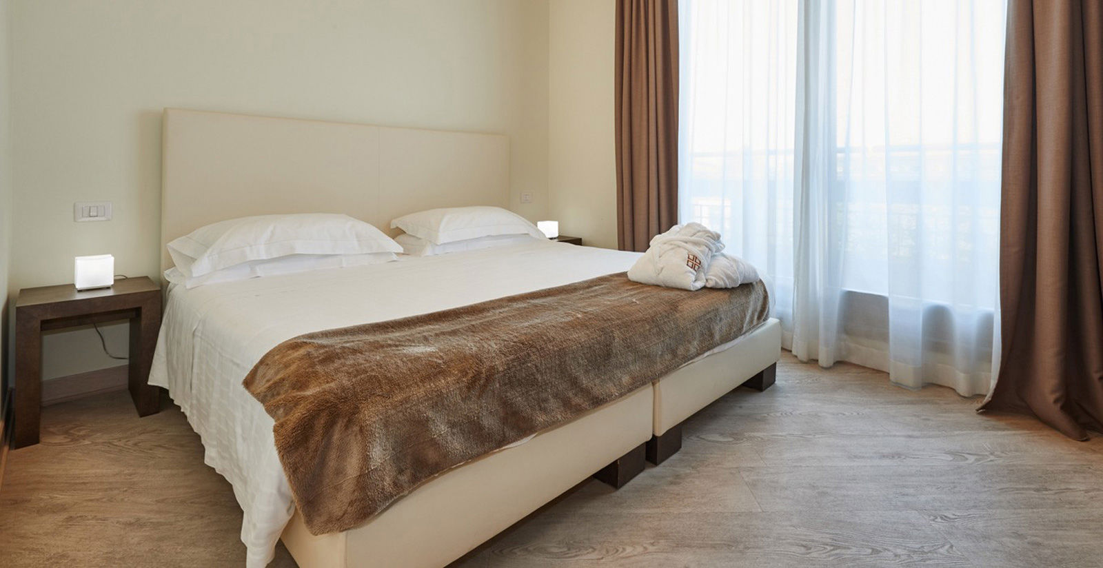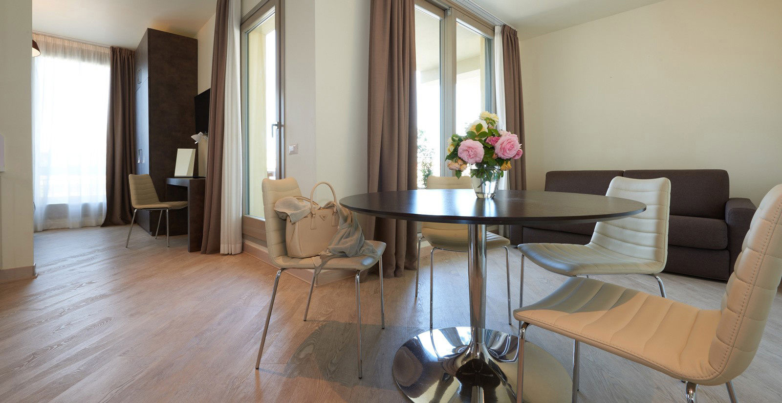 La suite, elegante e confortevole, è situata al quarto ed ultimo piano. Gli ambienti, illuminati da grandi vetrate, sono dotati di angolo cottura completamente attrezzato con: frigorifero, forno a microonde, lavastoviglie, utensili da cucina, piano cottura ad induzione e forno ventilato; l'appartamento è dotato di tavolo da pranzo, scrivania, comodo armadio guardaroba e di zona salotto con divano letto in morbido tessuto di cotone. Letto king size e materassi Simmons, Smart TV, armadio guardaroba con cassaforte connessione Wi-Fi e cablata gratuita. Bagno con doccia e set di cortesia.